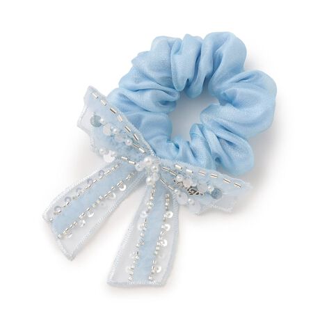 キラキラ艶めくオーガンジーで仕上げたシュシュです。きらきらのスパンコールやビーズを施したシアー素材で仕上げたリボンのワッペンをプラス。肌を出す季節には髪の毛につけるだけでなく、ブレスレットとしても活躍します。
