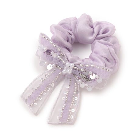 キラキラ艶めくオーガンジーで仕上げたシュシュです。きらきらのスパンコールやビーズを施したシアー素材で仕上げたリボンのワッペンをプラス。肌を出す季節には髪の毛につけるだけでなく、ブレスレットとしても活躍します。