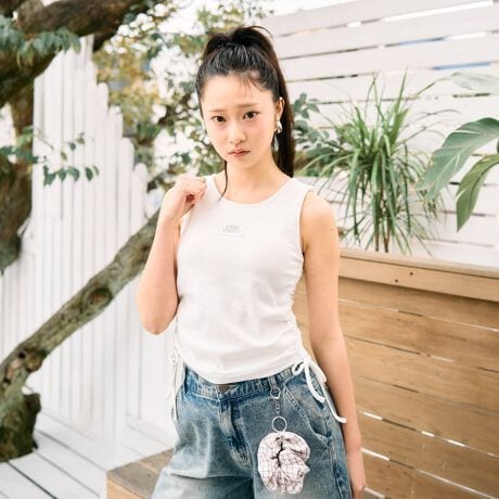 シャーリングデザインと共地ワッペンがグランジスタイルにハマるタンクトップです! 胸パッドは外せるため、用途や体型によって調節が利きます。