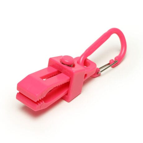 HUNG UPはクリップにカラビナが付いた便利なアイテム。アリゲータマウスにより、強いグリップでしっかりと掴むので、いったん挟んだものはめったに滑りとれることはありませんが、片手でボタンを押しながらスライドさせると簡単に取り外しできる仕様になっています。