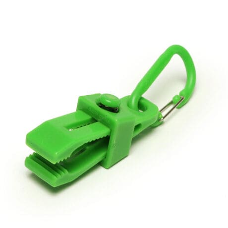 HUNG UPはクリップにカラビナが付いた便利なアイテム。アリゲータマウスにより、強いグリップでしっかりと掴むので、いったん挟んだものはめったに滑りとれることはありませんが、片手でボタンを押しながらスライドさせると簡単に取り外しできる仕様になっています。