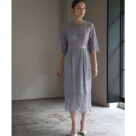 袖と肩ヨークが程よく透け、やや首の詰まったクラシカルな総レースのワンピース。