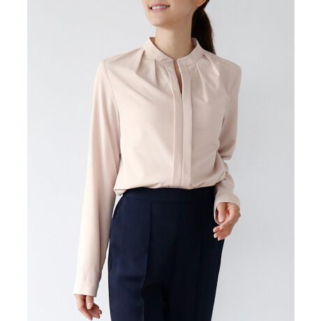 やや高めのネックに緩やかなタックが入った仕様で、上半身に細見え効果をプラス。