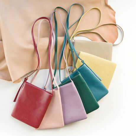 バッグの生産過程で生まれた牛革の端材を活かし、新たな形へと丁寧に仕立てたレザーポシェット。