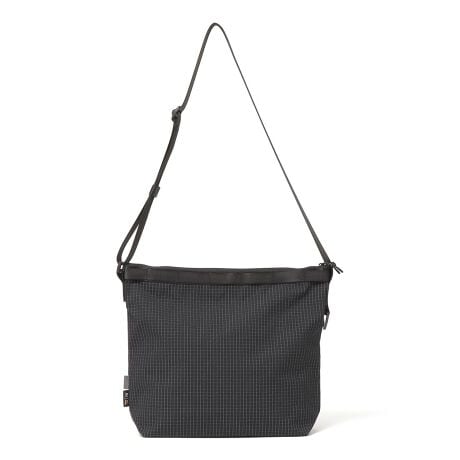ブラックにグレーの格子柄が入った、反射するリフレクターのリップストップ生地を使用したショルダーバッグ。