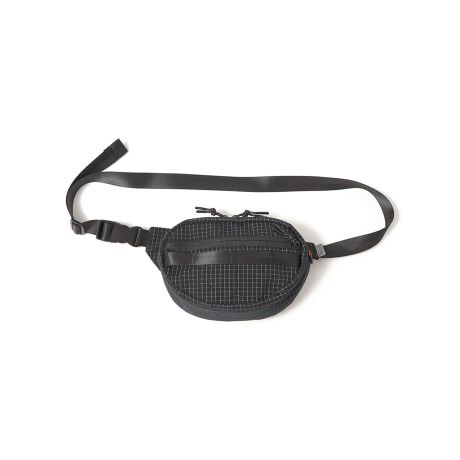 ブラックにグレーの格子柄が入った、反射するリフレクターのリップストップ生地のバッグ。