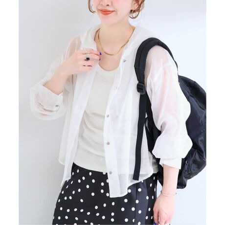 スッキリとした丈感に変更し、よりボトムスとのスタイリングがしやすくなり着回し力がアップしました。ドライタッチで落ち感のあるシアー素材で、シャツ感覚でさらりと羽織れます。ボタンも変更をし、カジュアルすぎない印象です。羽織りとしてはもちろん、ボタンを留めてトップスとしても使える万能なアイテム。