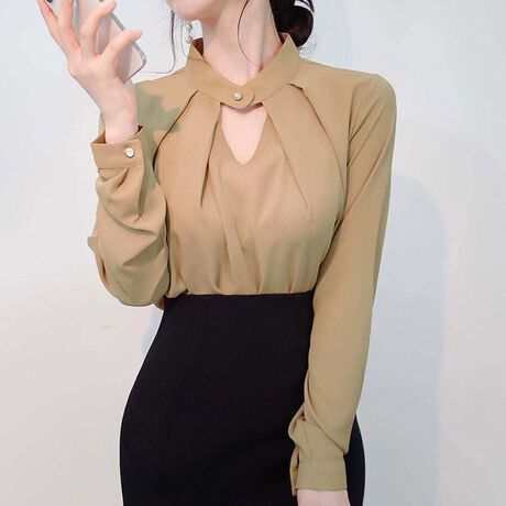 ボタンがないプルオーバータイプのシャツブラウス。