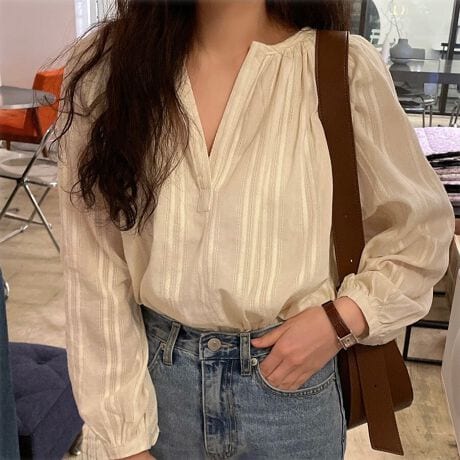 顔周りをスッキリと見せてくれるVネックデザインが、女性らしい印象に見せてくれます。