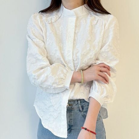 袖口には軽めのギャザー、ふんわりとしたボリューム感ブラウス。