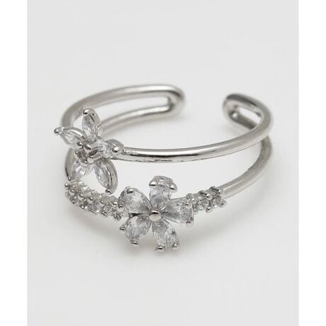 繊細なフラワーモチーフが連なるリング。きらめくストーンが指元を華やかに彩り、女性らしい印象を演出します。重ね付けにもおすすめのデザインです。