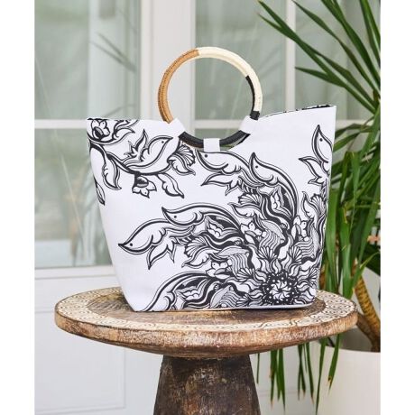 【Amina×VORRUK】タイのアーティストVORRUKとのコラボシリーズ[FLOWER OF THE SUN]。朝に花を咲かせるサンユウカは、一日の始まりに物事が動き出す吉兆を象徴する花。そして白、風車をモチーフに、過去を大切にしながら新しい風を迎える「温故知新」の想いを込めたデザイン。花が風に揺れ、身体に新しい流れが吹き込むような、始まりのエネルギーを感じさせるアートワーク。マチ付きのリングハンドル仕様。開口部はマグネットボタン、裏地付きの内ポケットあり。