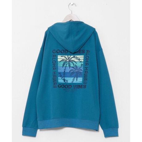 [型番:4CA-6220-2026]ふくれジャカード素材で仕立てたメンズフードパーカー。表情豊かな凹凸生地に、サーフ感のある刺しゅうとプリントを組み合わせたデザインが魅力です。程よいボリューム感で羽織りやすく、デニムやハーフパンツと合わせてハワイの空気を感じるカジュアルスタイルにおすすめです。