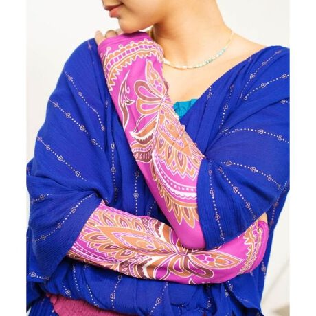 [型番:CAAP6202-2026]涼感・UV対策・吸水速乾を兼ね備えたアームカバー。妖艶な色柄がエキゾチックな雰囲気を演出し、いつものスタイルにアクセントをプラス。長めの丈でルーズに合わせてもきれいに決まります。UVカット加工/接触冷感加工/吸湿速乾