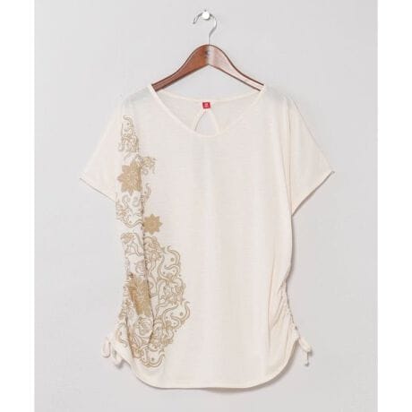[型番:CTK-6201-2026]【Amina×VORRUK】タイのアーティストVORRUKとのコラボ。朝日に咲く花と太陽をテーマにした曼荼羅のようなデザインが印象的なTシャツ。背中の開きとドローストリングの仕様で軽やかなシルエットが楽しめます。薄手で伸び感のある素材が心地よい一枚です。