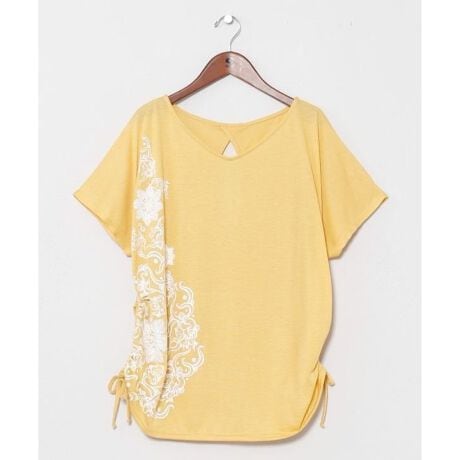 [型番:CTK-6201-2026]【Amina×VORRUK】タイのアーティストVORRUKとのコラボ。朝日に咲く花と太陽をテーマにした曼荼羅のようなデザインが印象的なTシャツ。背中の開きとドローストリングの仕様で軽やかなシルエットが楽しめます。薄手で伸び感のある素材が心地よい一枚です。
