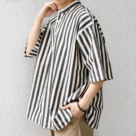 コットン×リネン素材で春夏にピッタリ!カラー毎に異なるストライプ柄を採用したバンドカラーシャツ