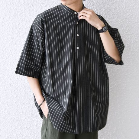 コットン×リネン素材で春夏にピッタリ!カラー毎に異なるストライプ柄を採用したバンドカラーシャツ