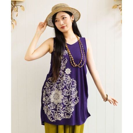 【Amina×VORRUK】タイのアーティストVORRUKとのコラボ。曼荼羅を思わせる繊細なプリントが目を引くタンクトップ。背中が大きく開いた涼しげなデザインで、おしりが隠れる長め丈も特徴です。脇のドローストリングでシルエットの変化も楽しめます。