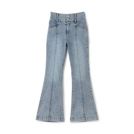 スタイル盛れが叶う人気のフレアデニムパンツです。センターラインがすっきりとしたシルエットに見せてくれます。後ろウエストにはアジャスターつきのゴム入り。体にフィットして動きやすいストレッチ素材を使用しており、デイリーウエアにおすすめです! 接触冷感仕様なので暑い時期のスタイリングに重宝します◎。