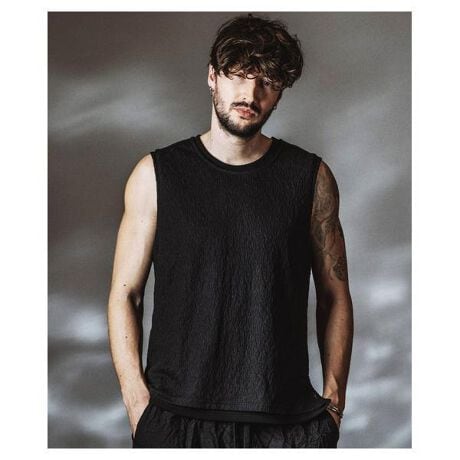 伸縮性に優れたテレコ素材と清涼感のあるシアーファブリックを重ねた、レイヤード構造のスリーブレスプルオーバー。