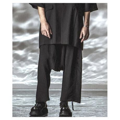 極端に深い股上と豊富な生地分量により、独特のドレープとボリュームを生み出すサルエルトラウザーズ。