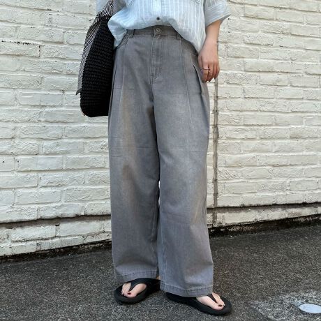 軽いデニム素材で、見た目よりも楽な履き心地でした。フロントのタックで程よくゆとりがありつつ、広がりすぎないシルエットですっきり見えします。カジュアルすぎず、大人っぽく着られるのも◎。Tシャツはもちろん、きれいめトップスとも合わせやすかったです!ヒール合わせだとすっきりとした印象で着用できます。