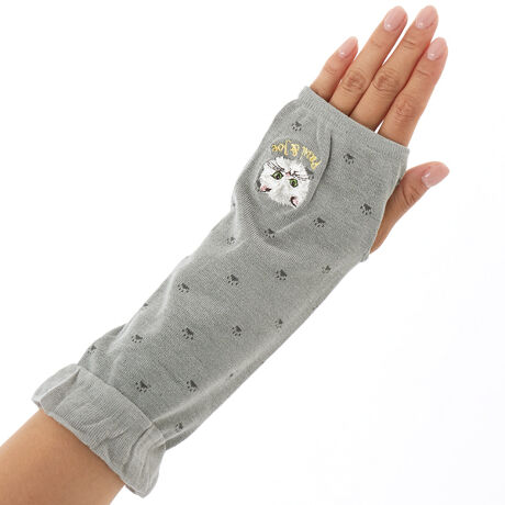 [型番:PJG660006-]ふんわり軽いレーヨン混ニットのショートアームカバー(指穴あり)。かわいらしい肉球ドットにポール&ジョーのアイコンねこ、ジプシーの刺繍がポイント。UVカット付き。
