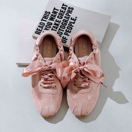くしゅっとしたシャーリングデザインが目を引く薄底スニーカー。ノーマルなシューレースと幅広のサテンリボンシューレースの2種類が付いており、コーディネートに合わせて雰囲気を変えて楽しめます。
