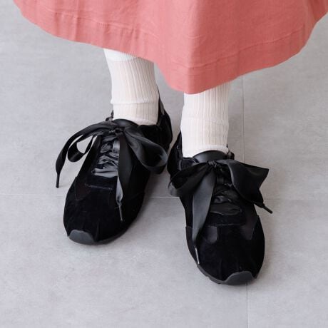 くしゅっとしたシャーリングデザインが目を引く薄底スニーカー。ノーマルなシューレースと幅広のサテンリボンシューレースの2種類が付いており、コーディネートに合わせて雰囲気を変えて楽しめます。