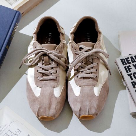 くしゅっとしたシャーリングデザインが目を引く薄底スニーカー。ノーマルなシューレースと幅広のサテンリボンシューレースの2種類が付いており、コーディネートに合わせて雰囲気を変えて楽しめます。