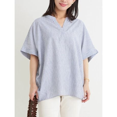 やわらかくて、さらさらな清涼感のある素材で仕立てたバンドカラーブラウス