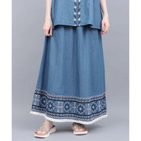 裾にエスニックムードたっぷりな幾何学刺繍を施したデニムスカート。