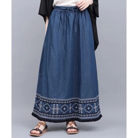 裾にエスニックムードたっぷりな幾何学刺繍を施したデニムスカート。