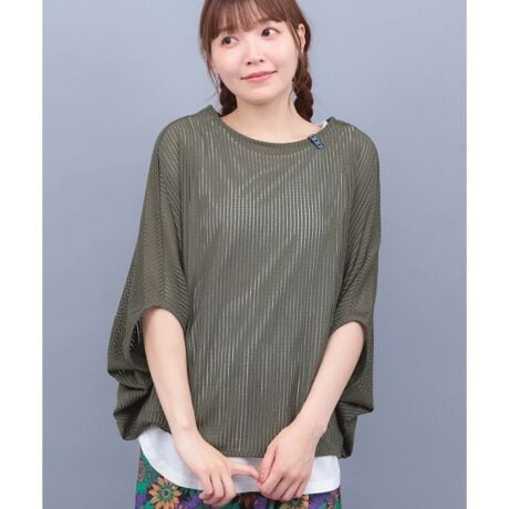 ゆったりとしたドルマンスリーブのメッシュトップスは、涼しげな透け感がポイント。