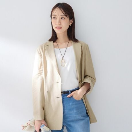 前立てはシングルブレストの2つボタンで縦長の前姿をクリーンに見せ、ややドロップしたソフトショルダーと程よいゆとりのリラクシーなシルエット。