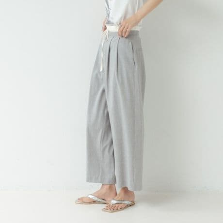 ハイウエストとフロントのタックがウエスト位置を高く見せるワイドパンツ。