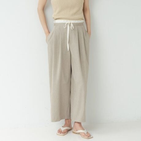腰周りはすっきり見え、ウエストトリミングとリボンの異素材ドローストリングがさりげないアクセントに。