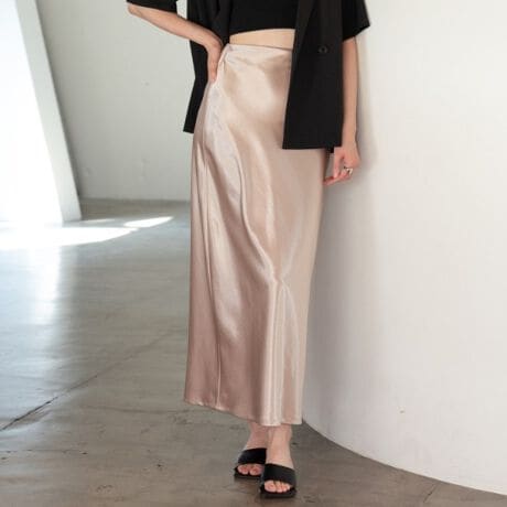 なめらかな落ち感とほどよい光沢が映える、すとんと縦に落ちるナローシルエット。