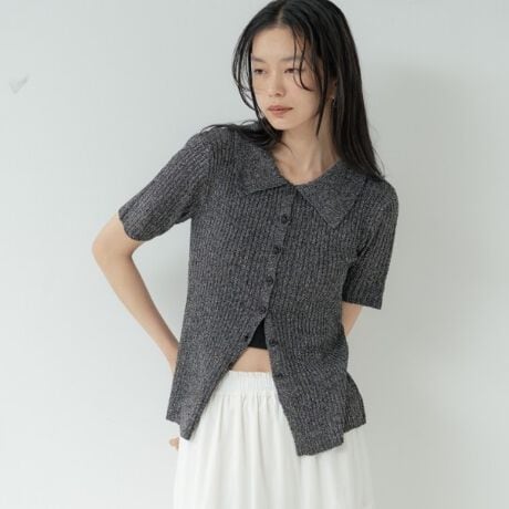 前立ての比率と細かなリブ編みが立体感を生み、肘上の袖丈が落ち着いた印象に。