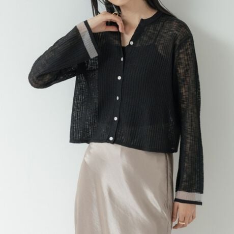 ゆるやかに広がるフレアスリーブの袖口をシアー糸でデザインしたカーディガン。