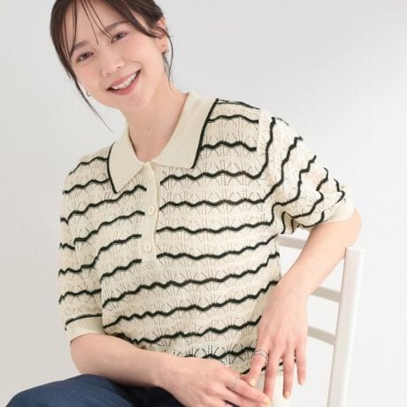 ナミナミとしたニュアンス柄がかわいいニットポロ。