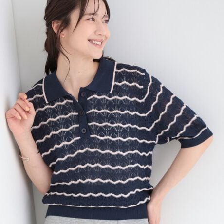 ナミナミとしたニュアンス柄がかわいいニットポロ。
