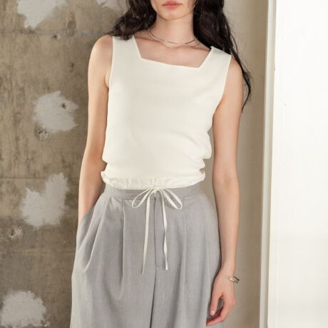 スクエアネックと幅広ストラップで顔まわり肩まわりがすっきり見えるニットタンク。