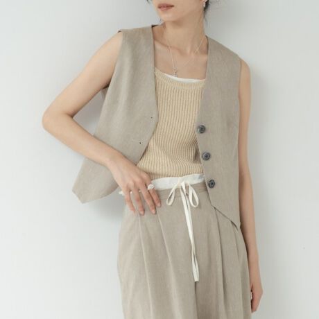 Vネックと三つ釦のフロントがモードな表情を作るジレ。