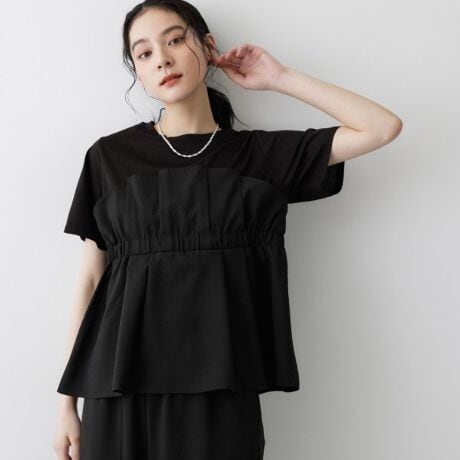 シンプルなTシャツに、ビスチェデザインをドッキングした一枚でサマになるトップス。