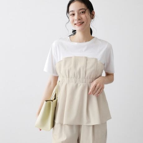 シンプルなTシャツに、ビスチェデザインをドッキングした一枚でサマになるトップス。
