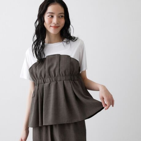 シンプルなTシャツに、ビスチェデザインをドッキングした一枚でサマになるトップス。