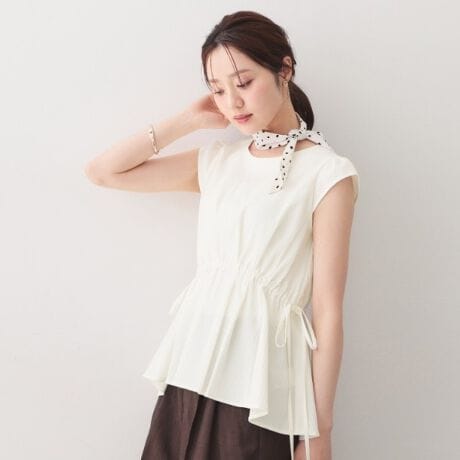 凹凸感のあるシボ素材が印象的なサイドリボンペプラムブラウス