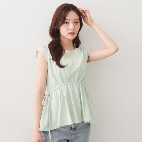 凹凸感のあるシボ素材が印象的なサイドリボンペプラムブラウス